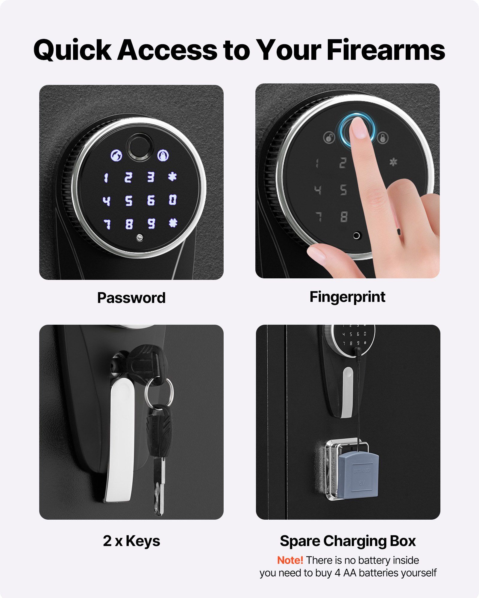 5.Quick Access: The 150° wide-angle door opens fully for a clear view of all firearms, making it easy to quickly retrieve your weapons. Inside, it is equipped with auto LED lights, ensuring visibility even in low-light conditions