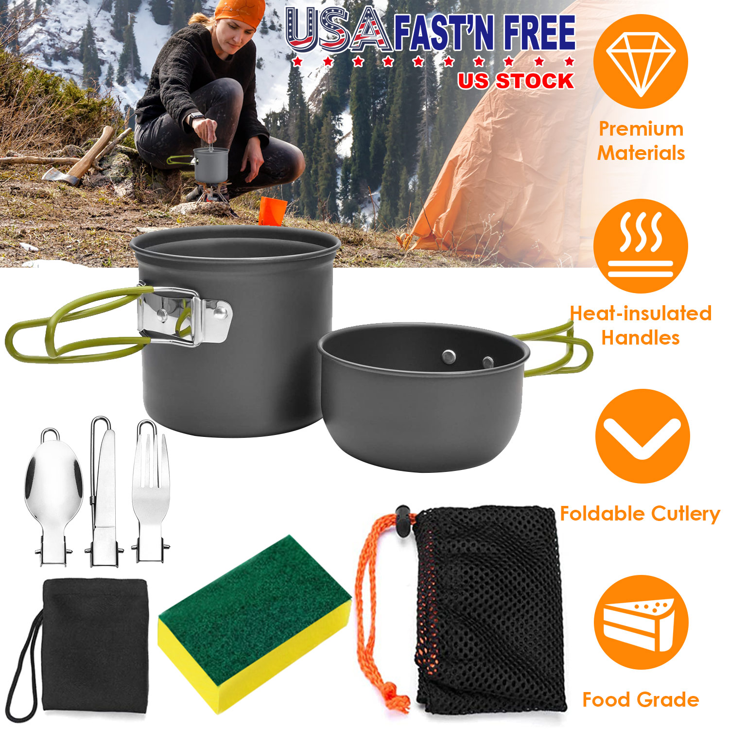 This cookware set contains 1 pot with lid, 1 fork, 1 knife, 1 spoon, and 1 cleaning sponge for making hot and delicious food during camping, hiking, and any other outdoor activity. Made of non-toxic and lightweight anodized aluminum, it’s safe, easier to clean and carry. The pot comes with a foldable and heat-insulated handle, which will not burn your hands. The whole set can be packed in a storage bag, space-saving and convenient.